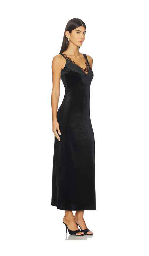 4th & Reckless Lilou Dress in Black. - size L (also in M, S, XL, XS) 4th & Reckless Lilou Dress in Black. - size L (also in M, S, XL, XS) Self: 93% polyester 7% elastane Lining: 100% polyester. Hand wash. Fully lined. Hidden side zip closure. V-neck design. Lace neckline trim. Heavyweight velvet fab...more