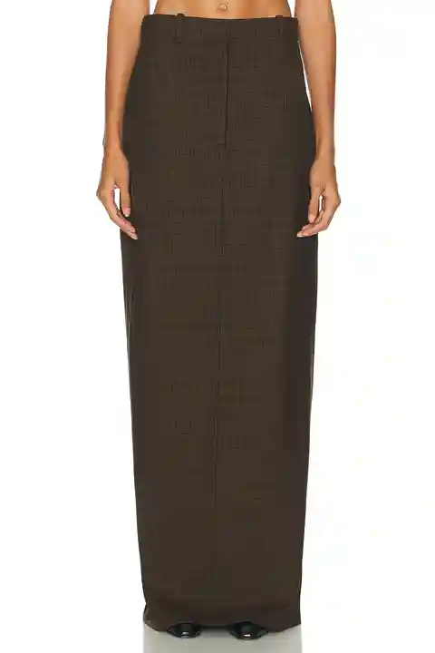 Acne Studios Inashy Skirt in Brown Self: 97% wool 3% elastane Lining: 67% acetate 33% polyester. Dry clean only. Zip fly with hook and bar clasp closure. Singular back welt pocket. Twill fabric with back vent. ACNE-WQ108. AF0558. About the designer: Acne Studios is a Stockholm-based fashion house wi...more