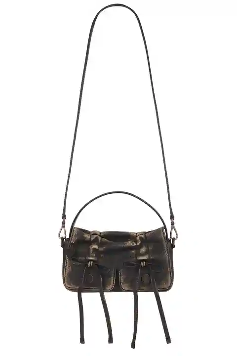 Acne Studios Multi Pocket Micro Bag in Brown Worn-effect leather exterior with leather lining. Made in Italy. Flaptop with magnetic closure. One main compartment. 2 interior card slot. Detachable shoulder strap. Measures approx 8.5 W x 4 H x 2 D Shoulder strap with a 18 drop Top handle with a 3.5 dr...more