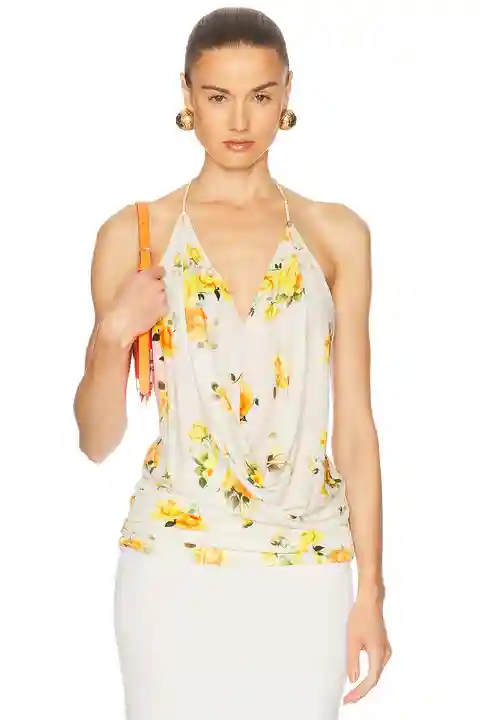 Acne Studios Tikata Top in White,Orange 100% viscose. Made in Portugal. Dry clean only. Pull-on styling. Draped fabric at neckline. Lightweight crepe fabric. ACNE-WS581. AC0723. About the designer: Acne Studios is a Stockholm-based fashion house with a multidisciplinary approach. Through founder and...more