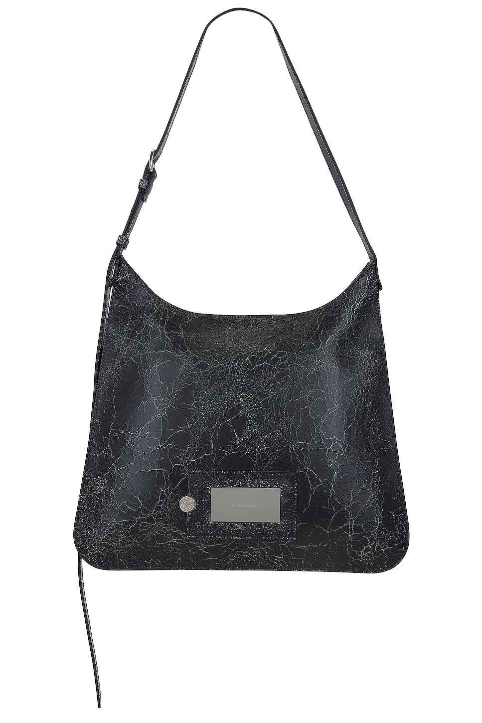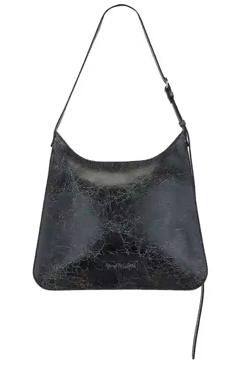 Acne Studios Shoulder Bag in Black Cracked leather exterior with leather lining. Made in Italy. Top zipper closure. One main compartment. Interior dual slip pockets. Detachable back mirror with etched you are beautiful phrase. Integrated detachable shoulder strap. Measures approx 14.5 W x 12 H x 1.5...more