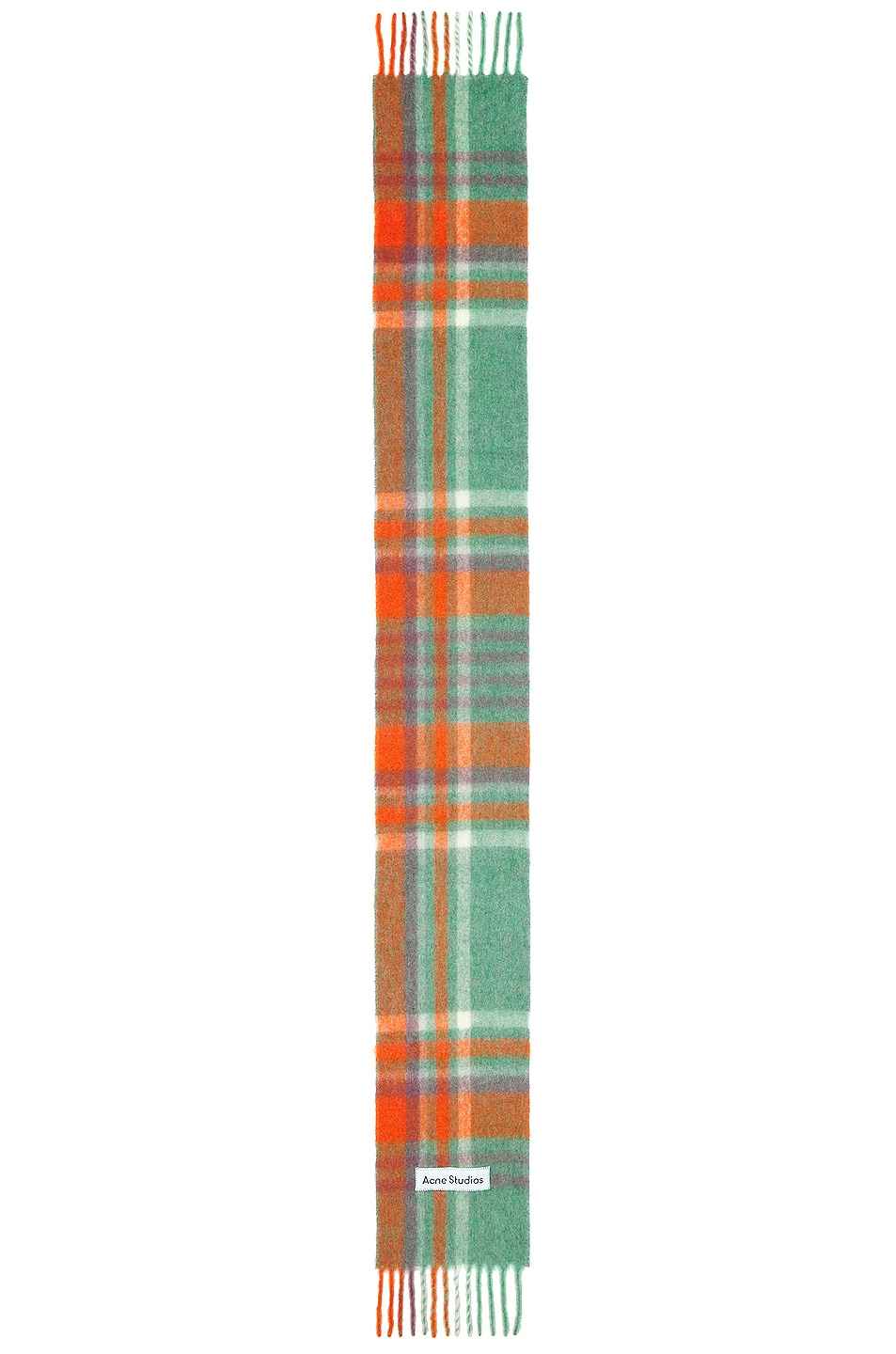 Acne Studios Striped Scarf in Orange 33% alpaca 25% wool 22% nylon 20% mohair. Made in Italy. Dry clean. Fuzzy knit fabric with Acne Studios logo patch and fringed trim. Measures approx 87 W x 11.5 H. ACNE-WA201. CA0293. About the designer: Acne Studios is a Stockholm-based fashion house with a mult...more