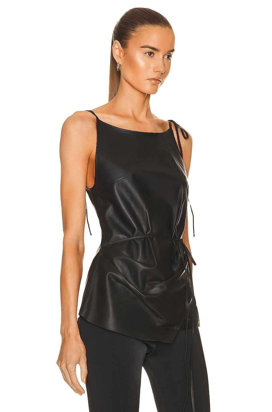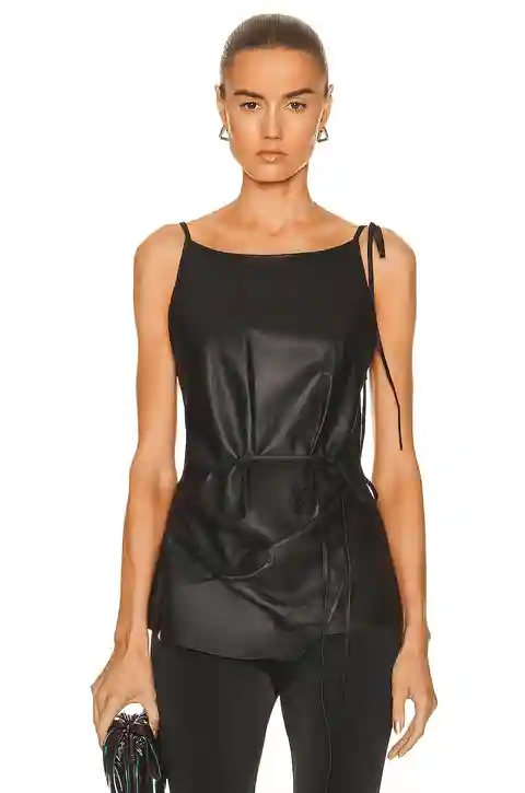 Acne Studios Sleeveless Blouse in Black 100% lamb leather. Made in Turkey. Spot clean only. Accent waist tie. Adjustable shoulder straps with tie closure. Hidden back zipper closure. ACNE-WS415. AC0500. About the designer: Acne Studios is a Stockholm-based fashion house with a multidisciplinary appr...more