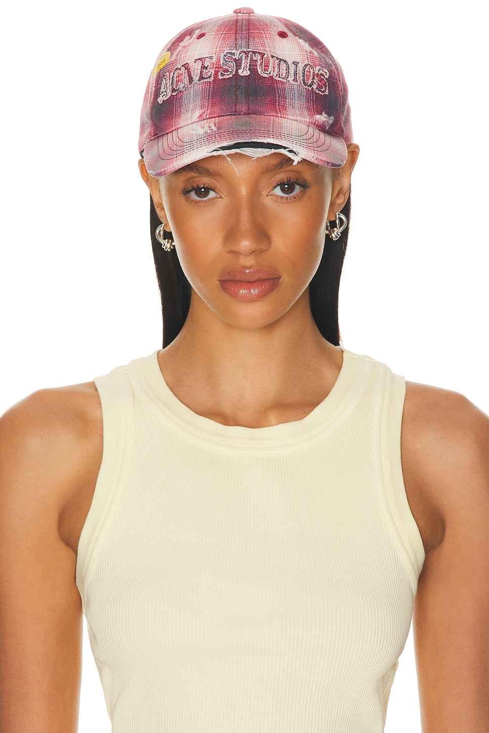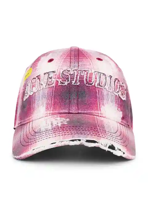 Acne Studios Baseball Hat in Red 100% cotton. Dry clean only. Adjustable back strap. 6-panel styling with ventilating eyelets. Embroidered and distressed front graphic. Distressed flannel hat. Brim measures approx 2.9 in length OS measures approx 23.5 in circumference. ACNE-WA254. C40411. About the ...more