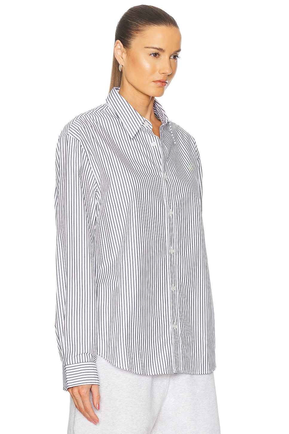 Acne Studios Sunnie Striped Shirt in Blue 100% cotton. Made in Morocco. Machine wash. Front button closure. Contrast logo detail at breast. Buttoned cuffs. Poplin fabric. ACNE-WS568. CB0097. About the designer: Acne Studios is a Stockholm-based fashion house with a multidisciplinary approach. Throug...more