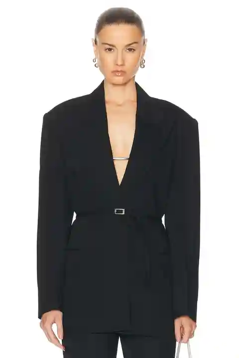 Acne Studios Suit in Black Self: 65% viscose 35% wool Lining: 100% viscose. Made in Portugal. Dry clean only. Adjustable waist belt with buckle closure. Padded shoulders. 3-pocket styling. Crepe fabric. ACNE-WO392. AH0294. About the designer: Acne Studios is a Stockholm-based fashion house with a mu...more