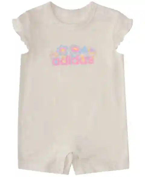 Blooming with sporty sweetness, this short-sleeve romper from adidas features a floral screen print intertwined with the signature logo. Ruffled sleeve hems and snap closures balance playful style with quick, practical changes.