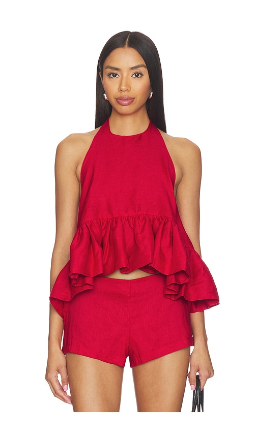 AEXAE x REVOLVE Linen Peplum Top in Red. - size L (also in XS, S, M) AEXAE x REVOLVE Linen Peplum Top in Red. - size L (also in XS, S, M) 100% linen. Made in China. Hand wash cold. Halterneck tie closure. Lightweight linen fabric. Cropped front. Ruffle hem. AEXR-WS62. BON083773.
