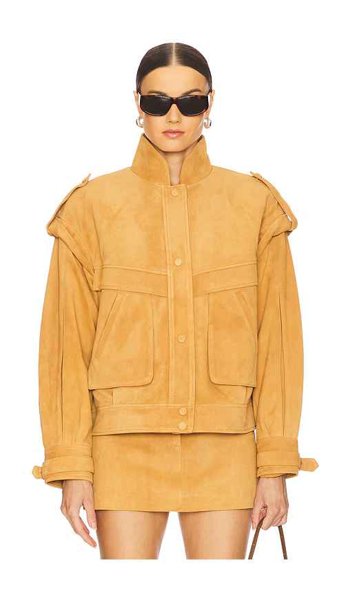 AEXAE Leather Suede Oversized Jacket in Brown. - size M (also in S, XS, XXS) AEXAE Leather Suede Oversized Jacket in Brown. - size M (also in S, XS, XXS) Self: 100% lambskin leather Lining: 100% viscose lining. Made in China. Dry clean only. Front snap button closure. Front slant pockets. Padded sho...more