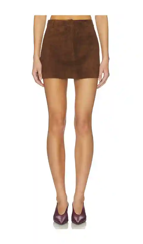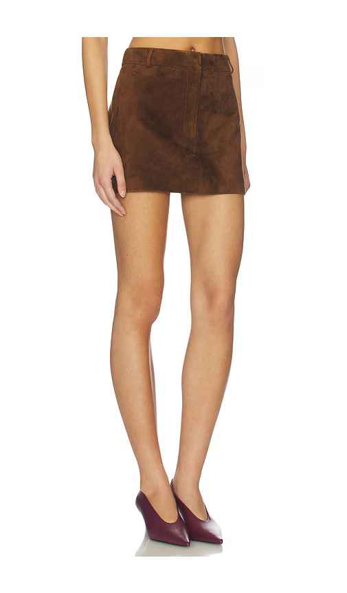 AEXAE x REVOLVE Leather Suede Mini Skirt in Chocolate. - size L (also in M) AEXAE x REVOLVE Leather Suede Mini Skirt in Chocolate. - size L (also in M) Self: 100% lambskin leather Lining: 100% viscose. Made in China. Dry clean only. Fully lined. Front zip with snap button closure. Lightweight suede ...more
