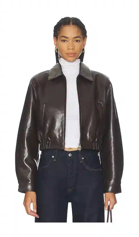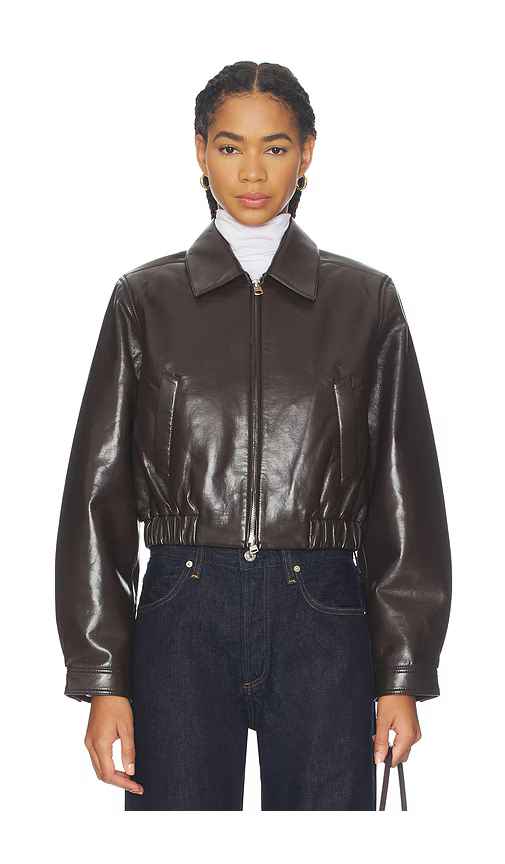 AGOLDE Essie Jacket in Chocolate. - size XL (also in M, S, XS) AGOLDE Essie Jacket in Chocolate. - size XL (also in M, S, XS) Self: 50% recycled calf leather, 30% Polyuuerathane, 10% Polyester Lining: 100% Polyester. Pofessional leather cleaning. Hidden front zipper closure. Fron slip pockets. AGOL-...more