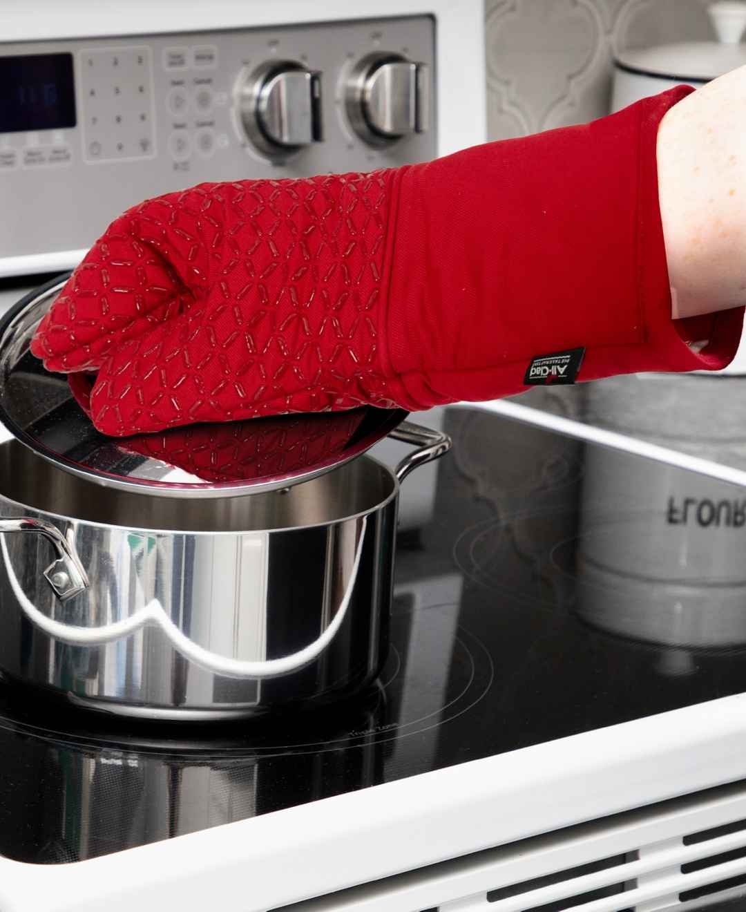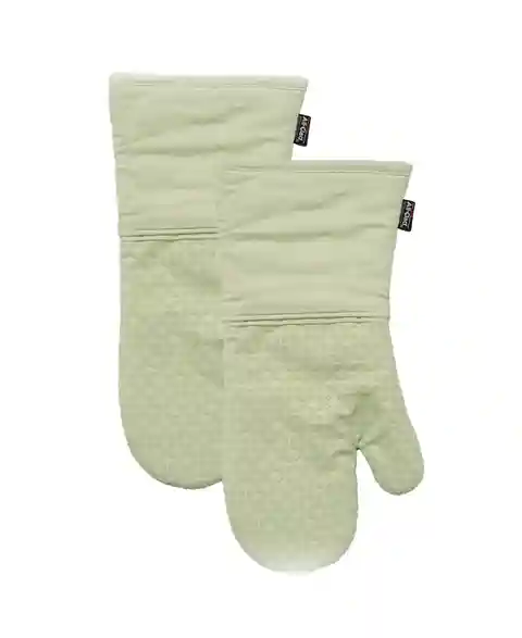 All-Clad Ogee Oven Mitts offer heat protection up to 500F with durable cotton twill and non-slip silicone grips. The 14-inch length shields hands, wrists, and forearms. They're safe, stylish, and essential for cooking, baking, or grilling.