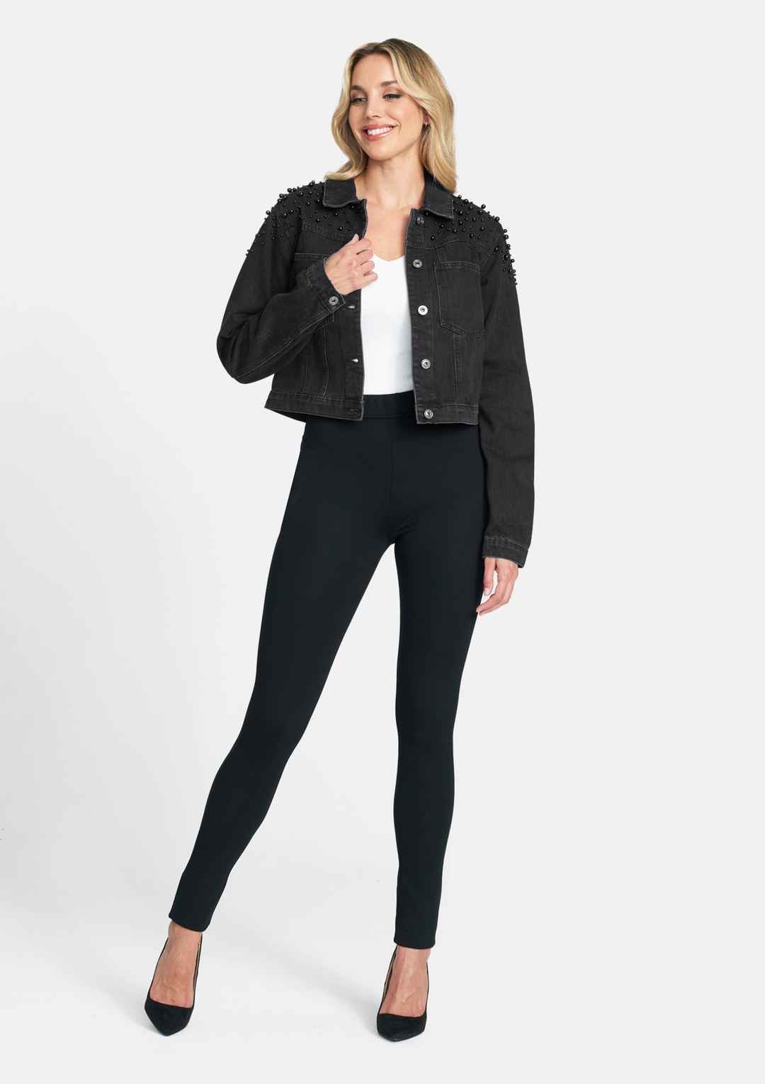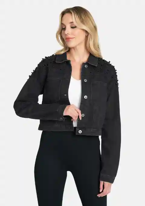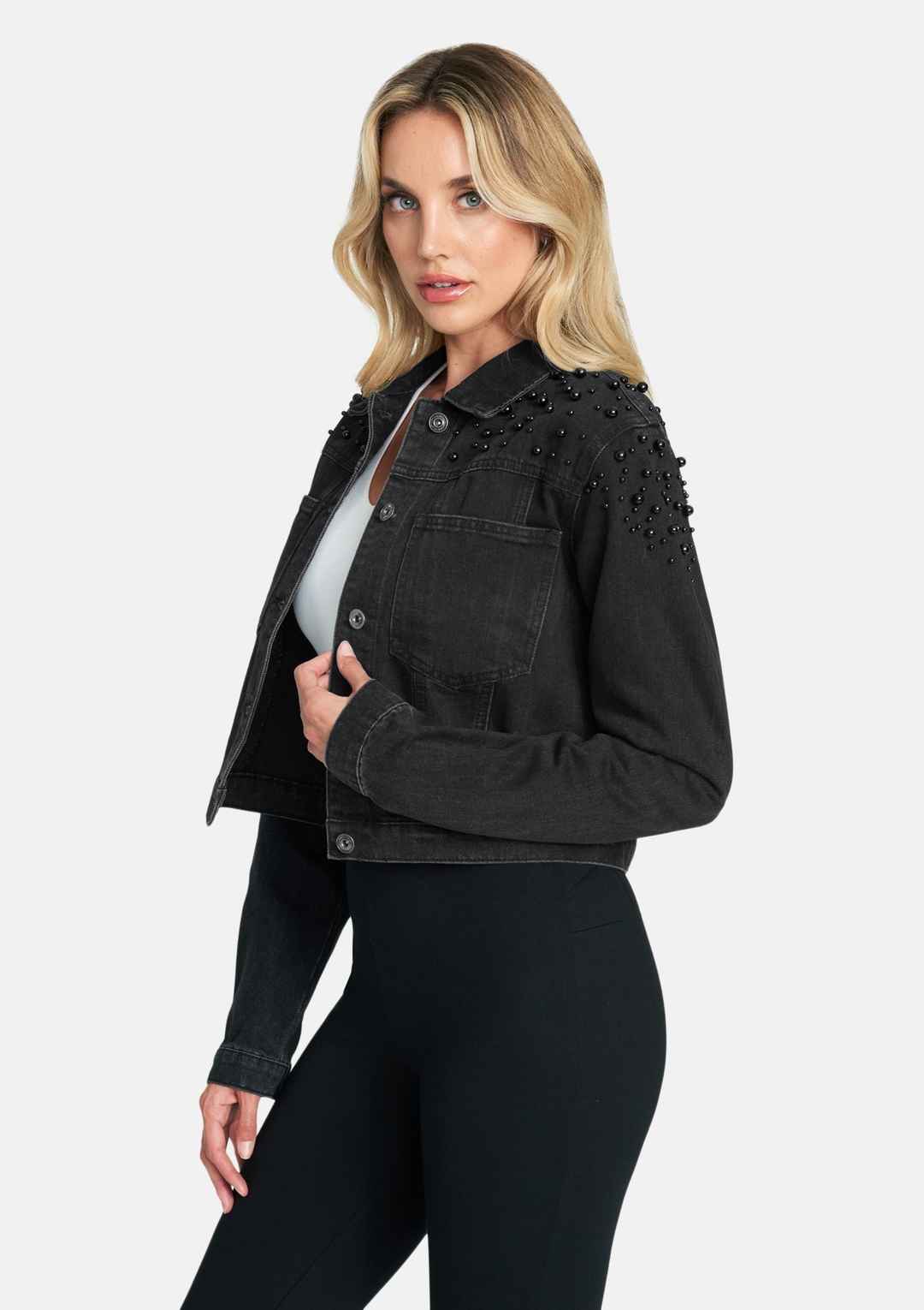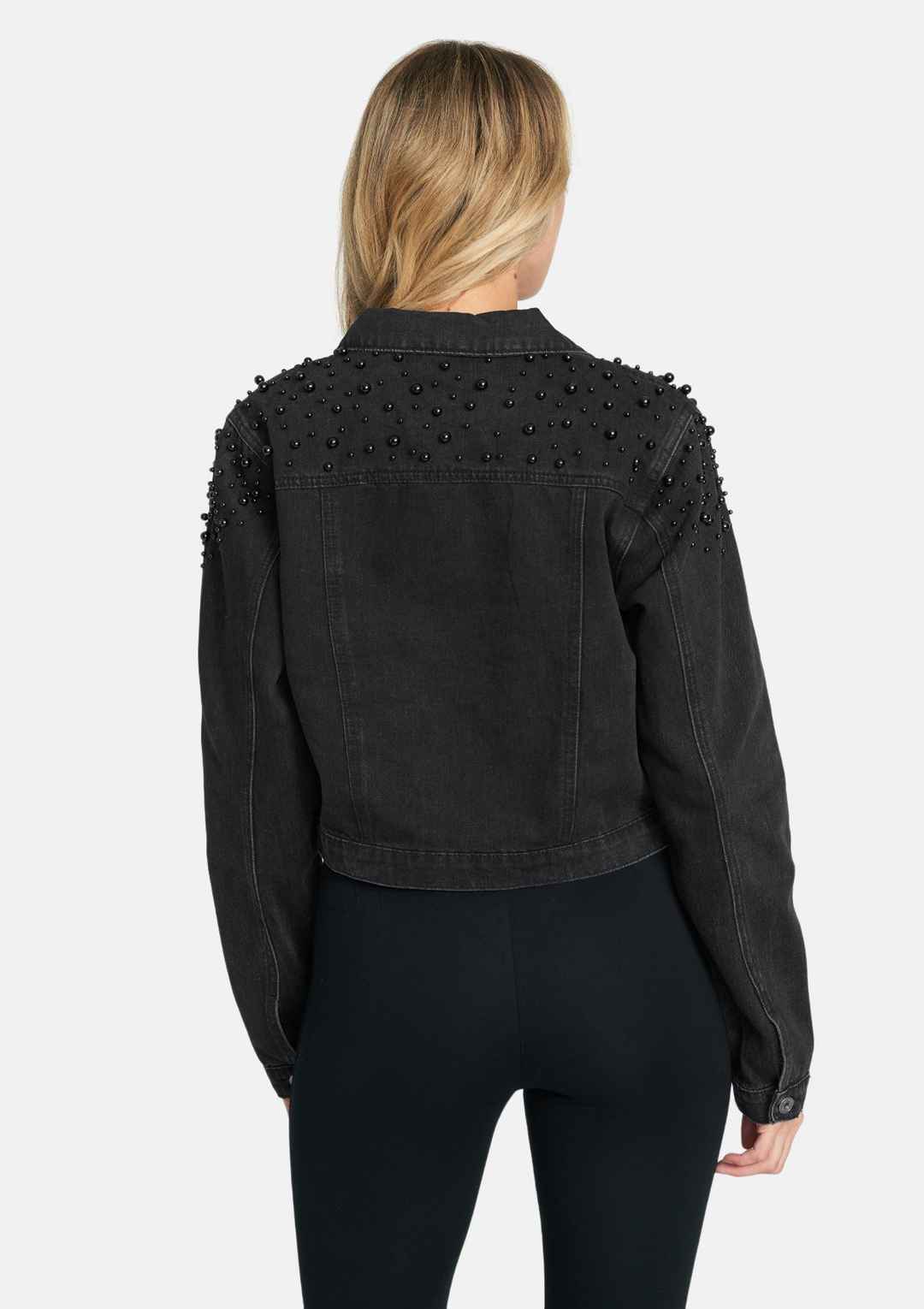 Gradient pearl embellishments breathe '80s glamour into this cropped denim jacket. Featuring two front pockets, this piece is a modern take on the basic jean jacket. | Alloy Apparel Tall Ava Embellished Denim Jacket for Women in Black Size XS