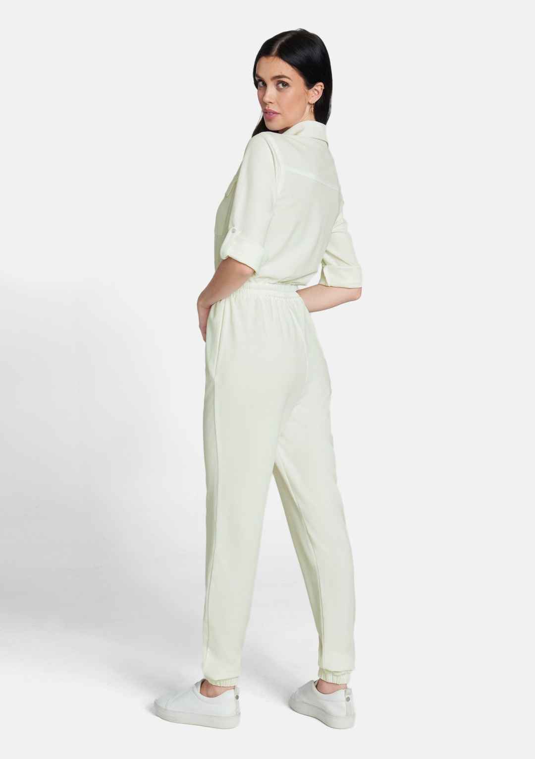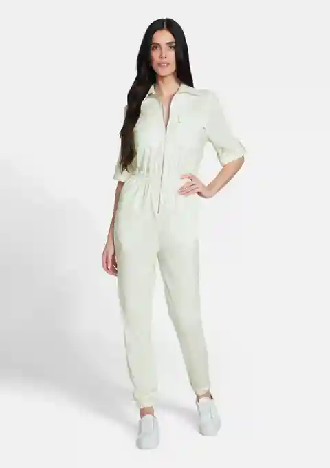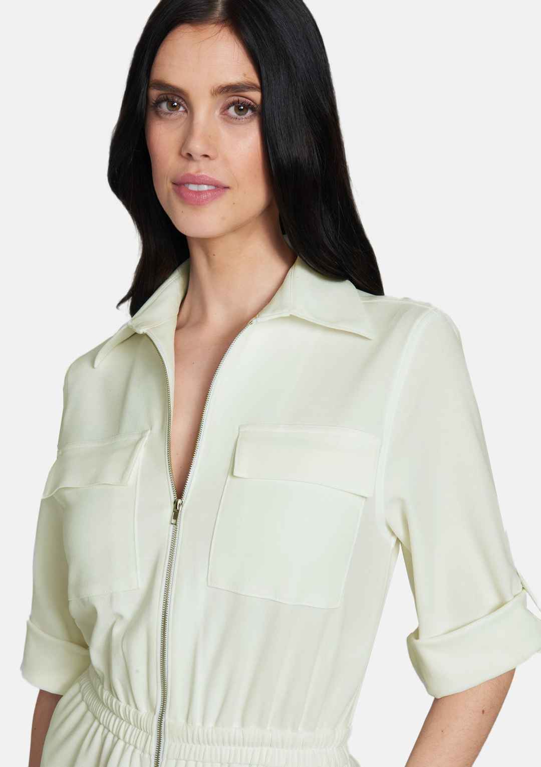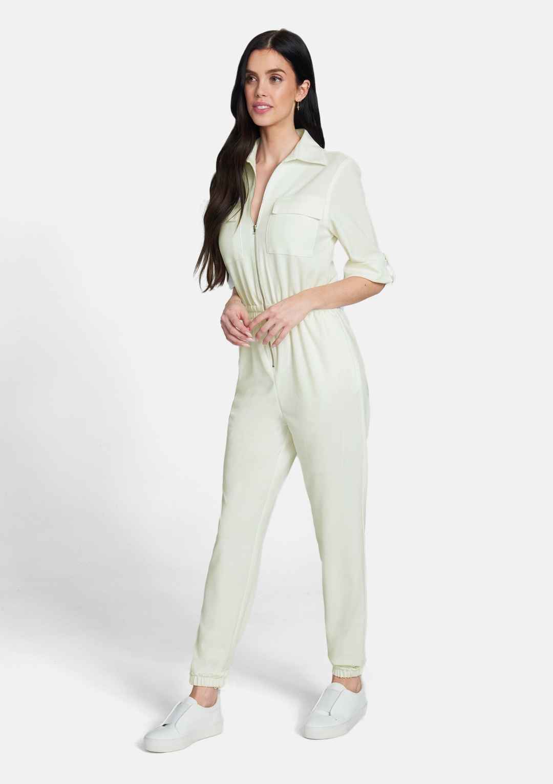 Keep your wardrobe tuned up and on trend with this elevated jumpsuit. The Shayna jumpsuit is made from a flowy & lightweight lenox crepe fabric, made to move with your body. Featuring a zipper front detail, cinched elastic waistband, collar neckline, button tabbed sleeves, side pockets, and utility ...more