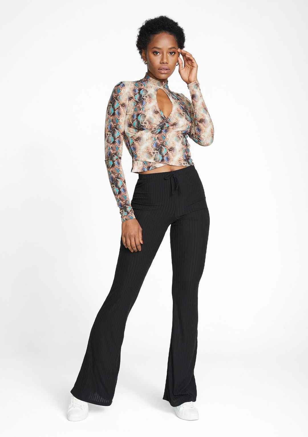 Our Tall Rib Knit Long Sleeve Cropped Top makes the perfect set paired with our Tall Elana Rib Knit Pants. With a high neck, keyhole detail, and a faux wrap to flatter you while keeping you comfortable. | Alloy Apparel Tall Elana Keyhole Long Sleeve Top for Women in Coco Snake Size Small
