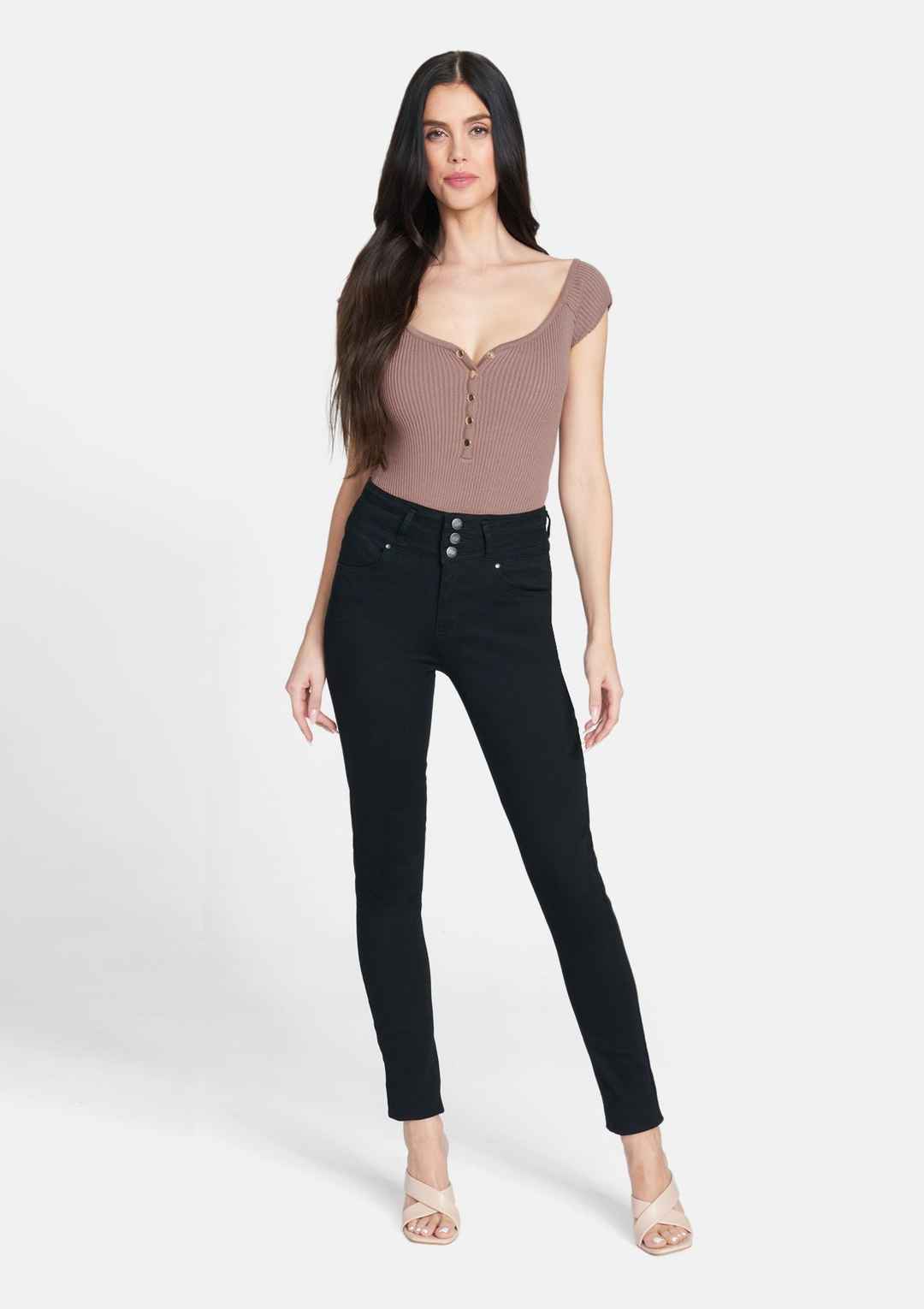 The Kim button-front bodysuit features a stunning ribbed knit construction, short sleeves, and snap button closure at the hem. Bringing an easy-to-layer style to your wardrobe. | Alloy Apparel Tall Kim Ribbed Bodysuit for Women in Taupe Size Small