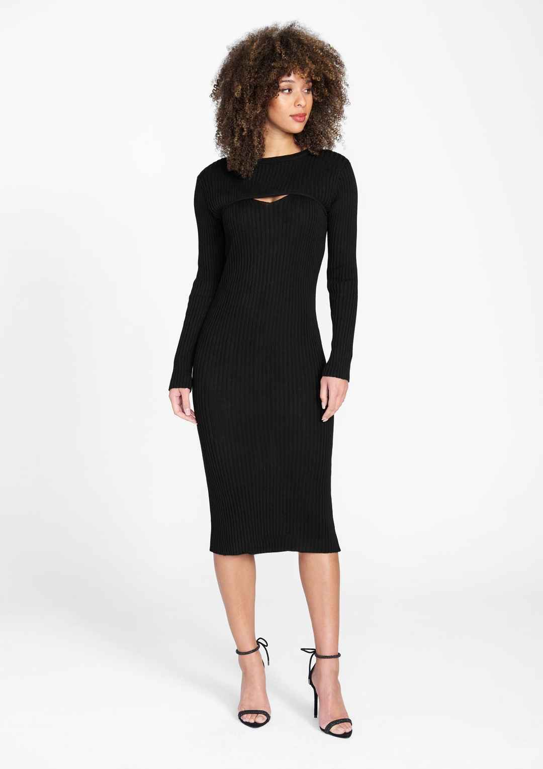 Our Alexa slim-fitting midi knit dress is so chic! Featuring a faux-shrug look, with a small V-cutout, long sleeves, round neckline, and an all over ribbed knit material. This dress is one piece, no need to worry about the shrug moving around! | Alloy Apparel Tall Alexa Knit Midi Dress for Women in ...more