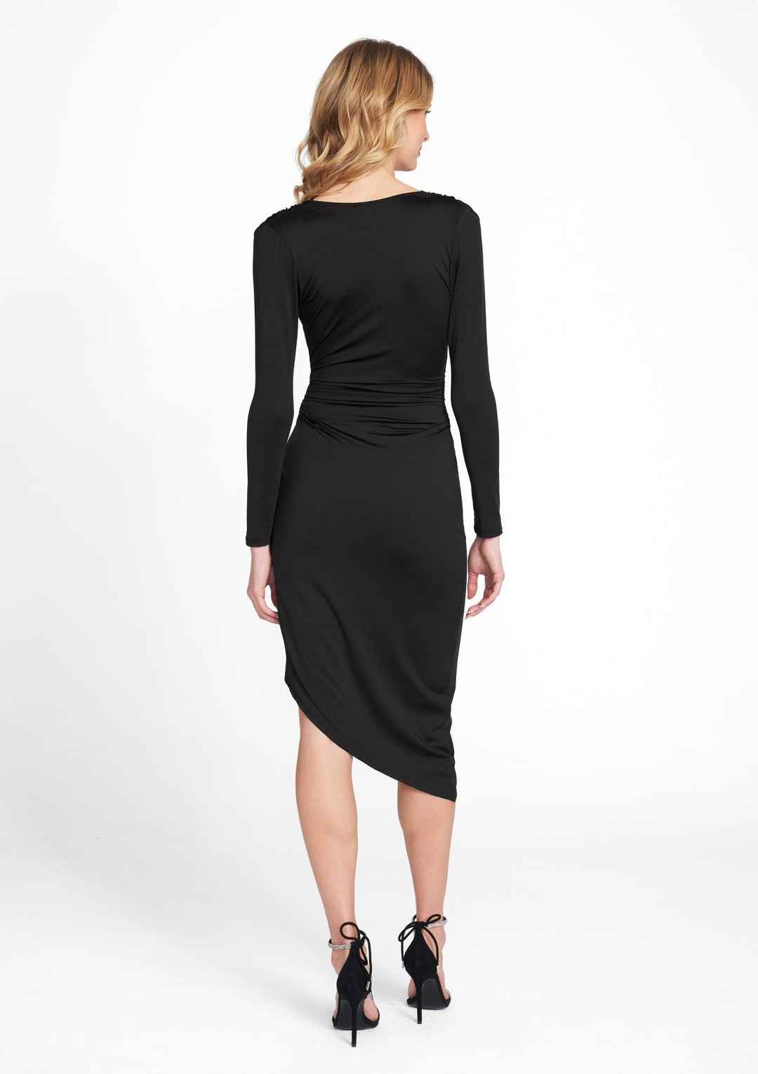 Dial up the drama in this slinky asymmetrical midi dress designed to entice with a slit front detail. The Collette dress features a wrap front v-neckline, with a twisted side knit detail, long sleeves, and cinched shoulders and side detail. | Alloy Apparel Tall Collette Midi Dress for Women in Black...more