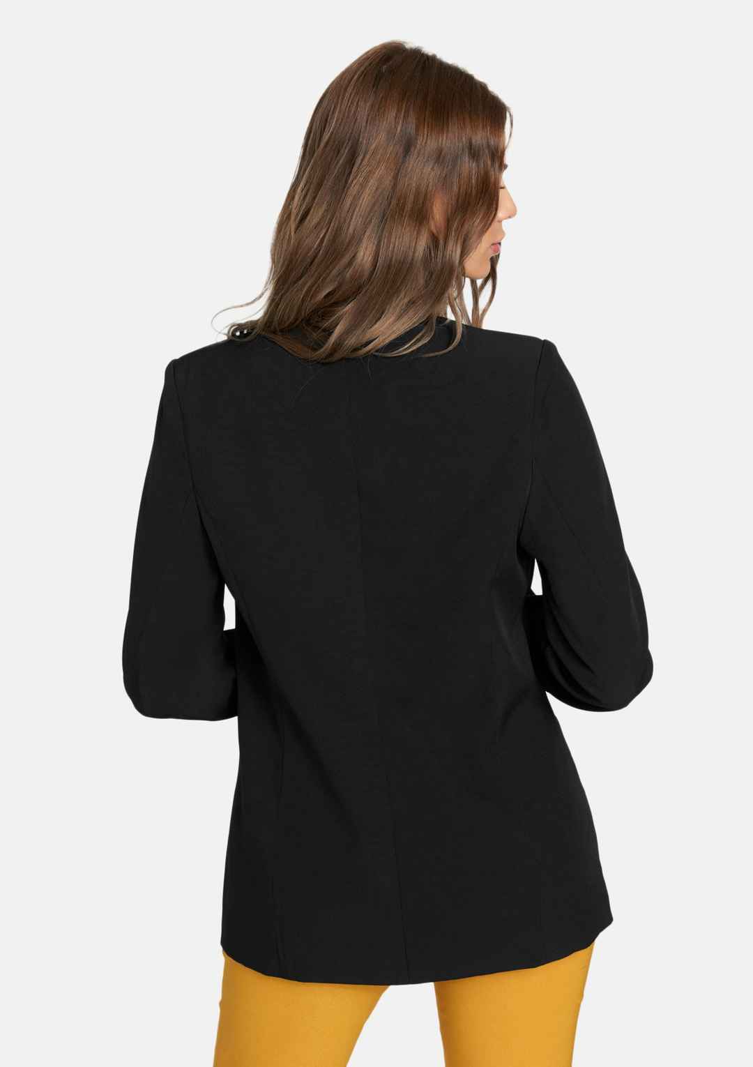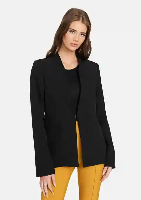 Chic for the office or the weekend, this open-front blazer exudes sophisticated style with smooth stretch fabric and a uniquely structured lapel. The Jayda features a hidden hook-and-eye closure and long sleeves. | Alloy Apparel Tall Jayda Structured Blazer for Women in Black Size XS
