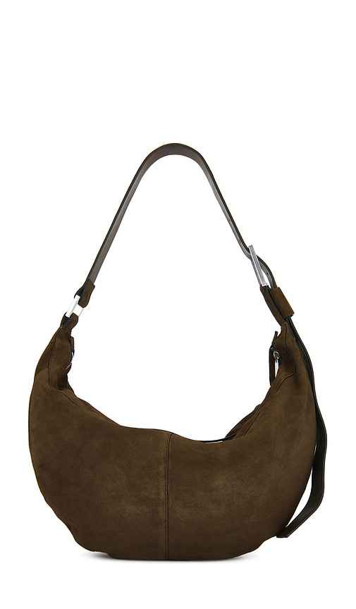 ALLSAINTS Luna Shoulder Bag in Brown. ALLSAINTS Luna Shoulder Bag in Brown. Suede leather exterior with cotton lining. Imported. Top zip closure. One main compartment with interior slip pocket. Soft slouchy, shoulder-bag silhouette with adjustable strap. Measures approx 12.6 W x 6.3 H x 3.5 D Should...more