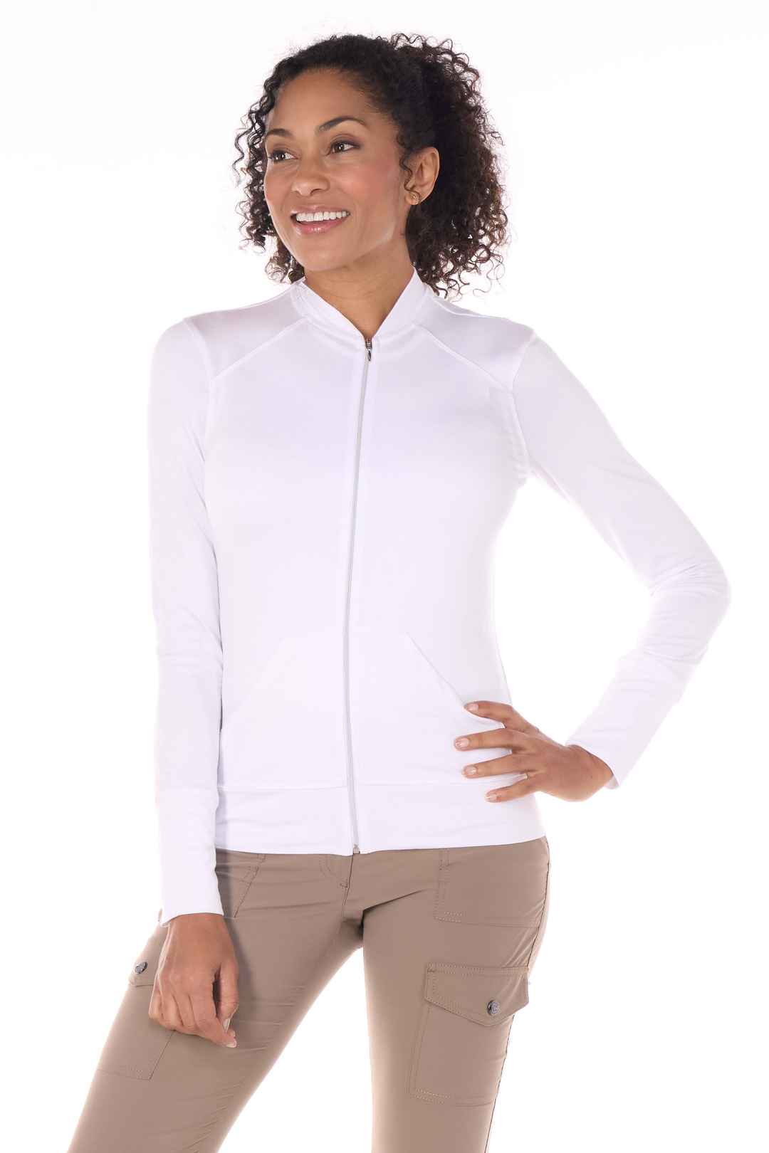 Land the sporty-chic look with this ultrasoft, lightweight jacket. The sleek shape is thoughtfully finished with a chic baseball collar and front kangaroo pouch pockets for stashing small items. Whether you wear it to your workout or to travel around the world, this essential layer keeps you in comf...more