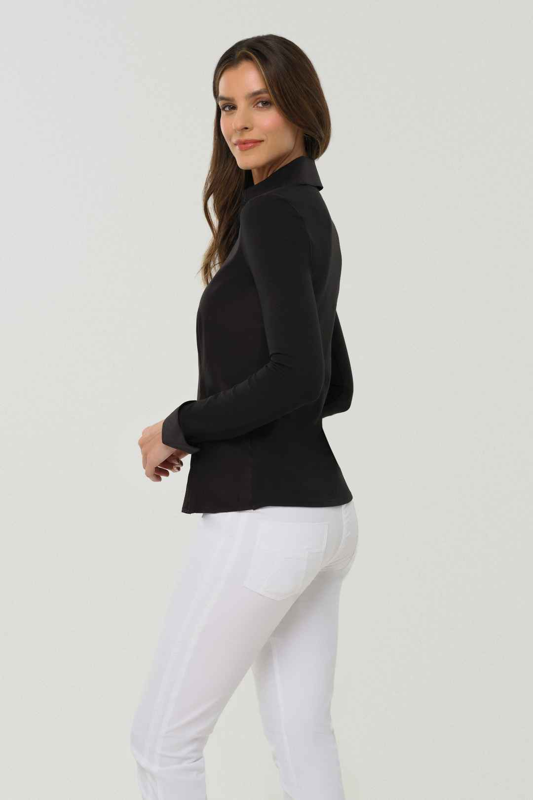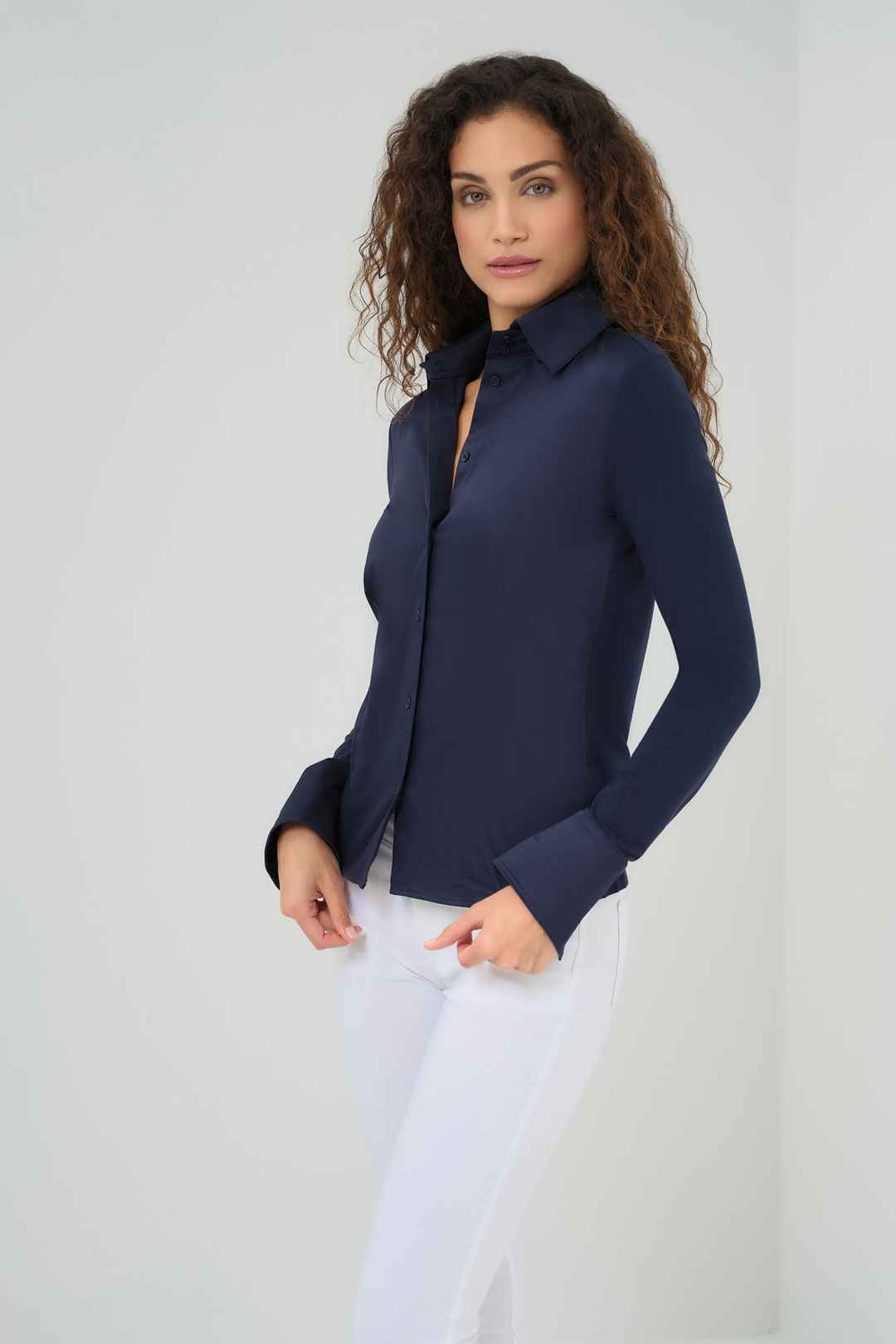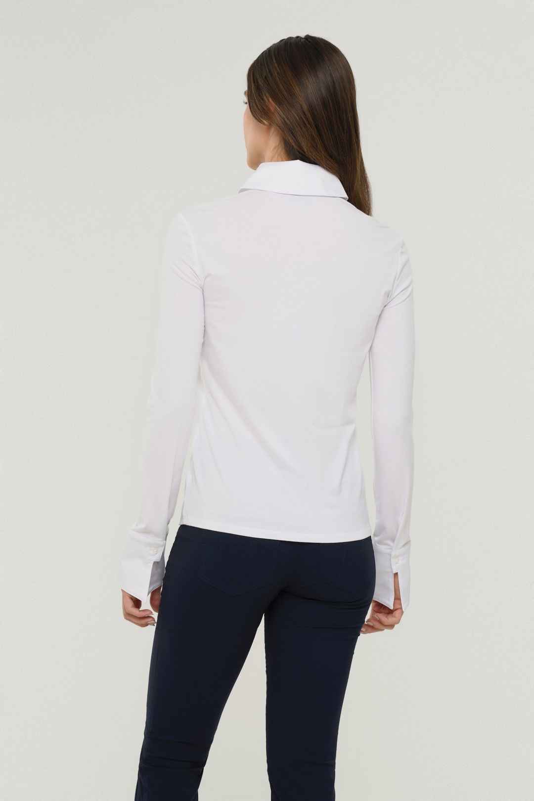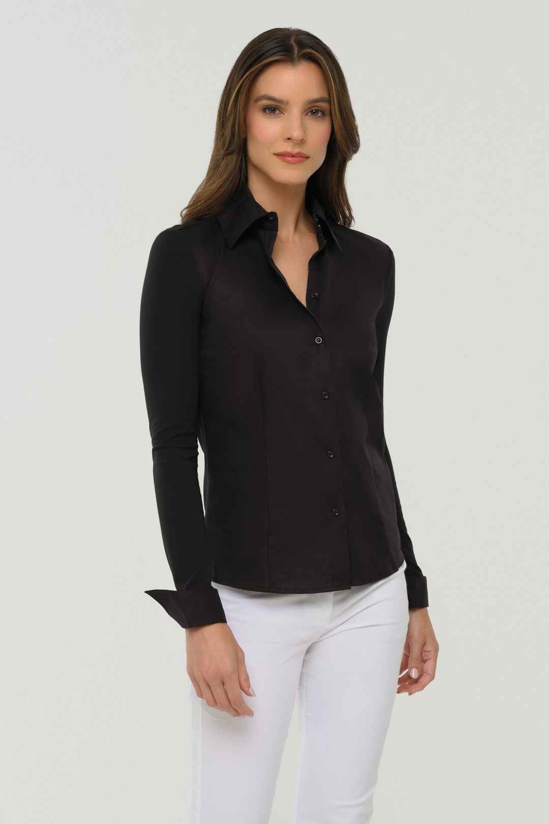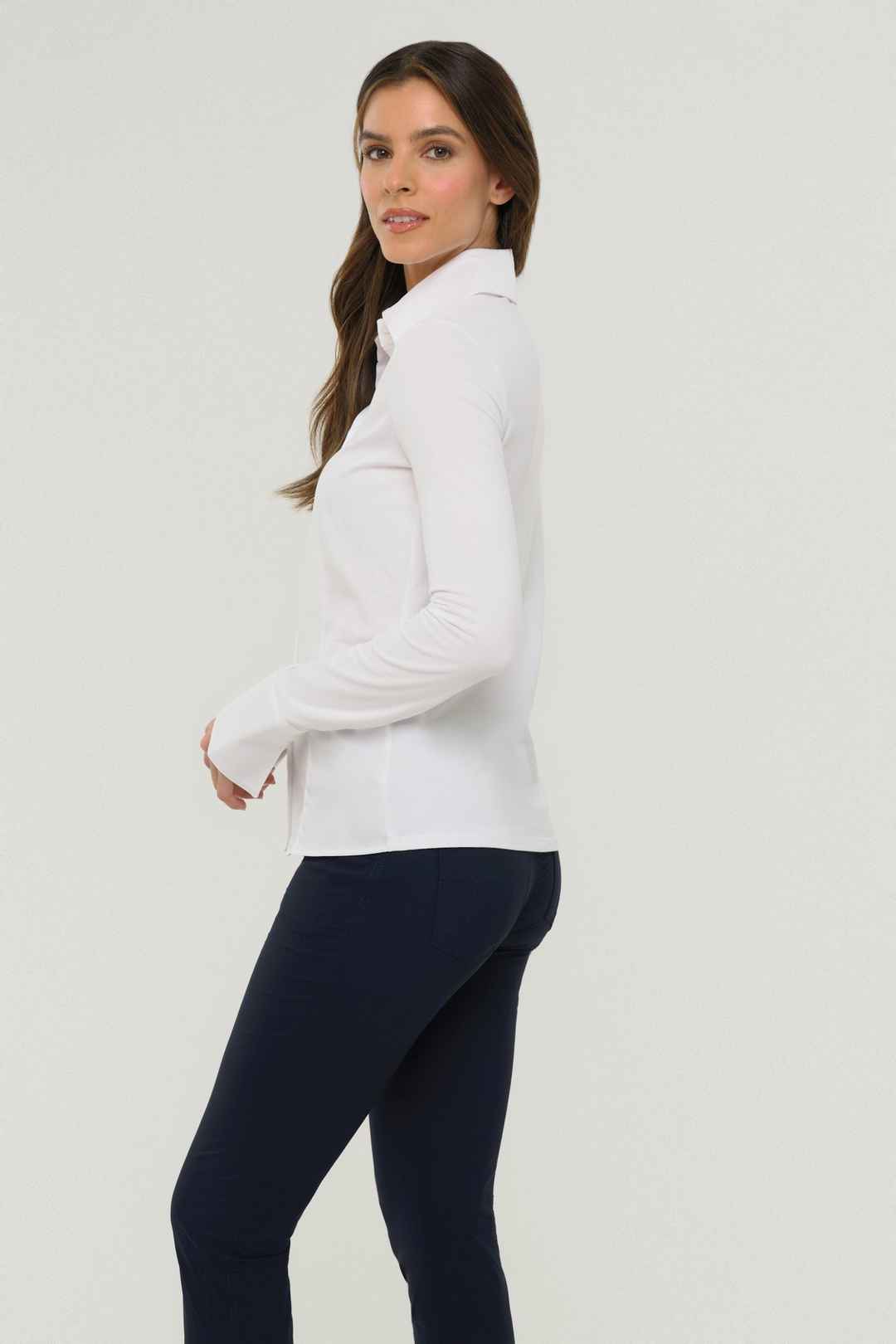 Meet the perfect elevated take on the classic button-up white shirt the Alida Button Down Poplin Shirt. This stylish women's button-up shirt features a crisp white color with a modern slim fit silhouette and flattering designer seaming. A timeless button front-closure and bold menswear-inspired col...more