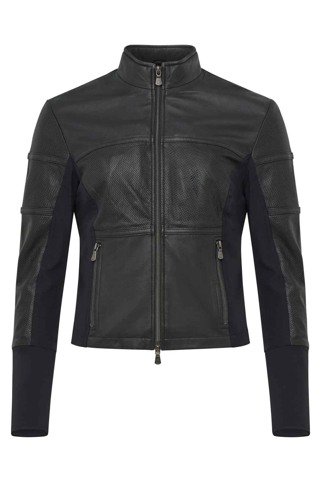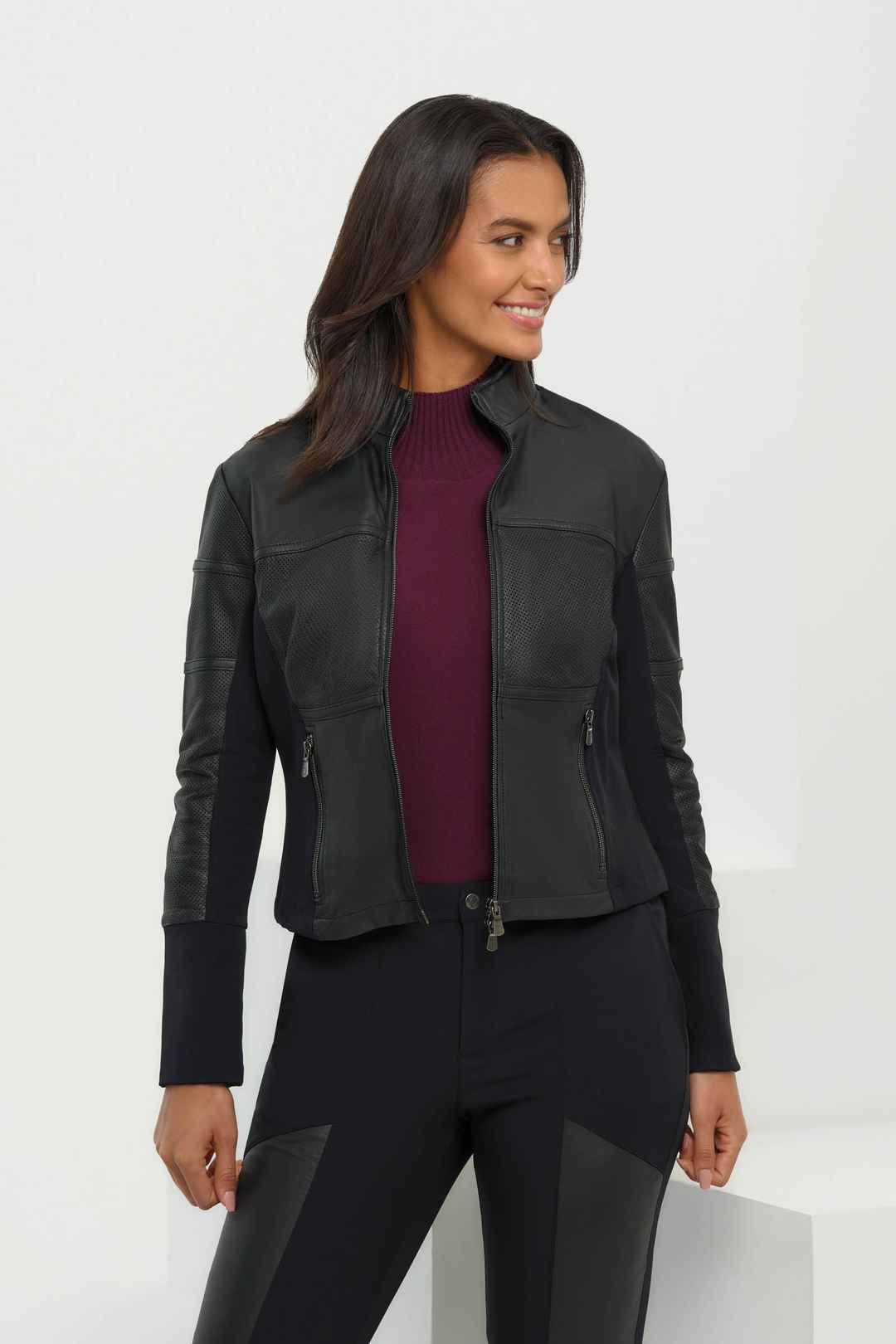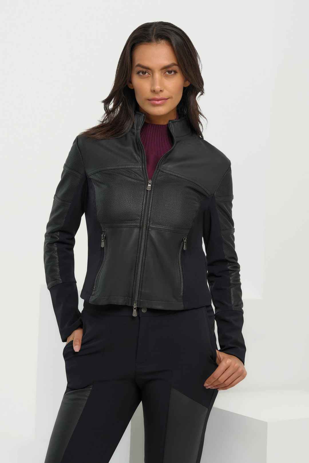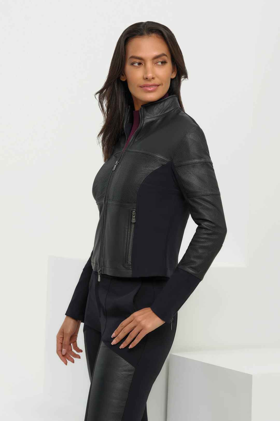 The Erin Leather Jacket is all about the details. Featuring perforated leather panels, soft-stretch waist fabric, and two-way zippers, this jacket is sure to turn heads. Pair it with your go-to jeans or complement it with our latest Anatomie leather styles. Slim Fit Stand Collar Long Sleeve Mixed Me...more