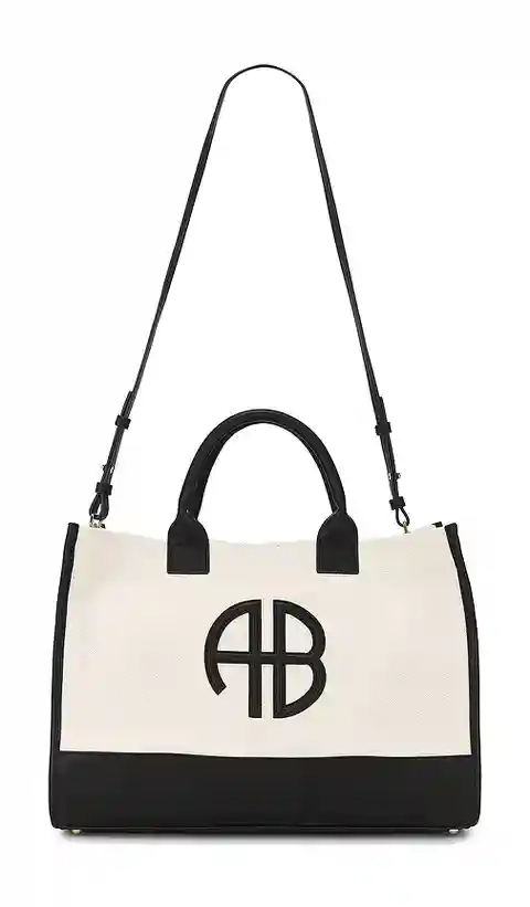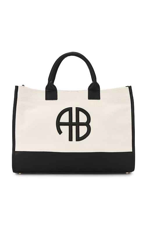 ANINE BING Lara Medium Tote Bag in Cream. ANINE BING Lara Medium Tote Bag in Cream. 100% cotton canvas. Made in China. Top magnetic closure. One main compartment. Interior zip pocket. One interior magnetic slip pocket. Monogram leather patch. Measures approx 16 W x 12 H x 6 D Shoulder strap with a 1...more