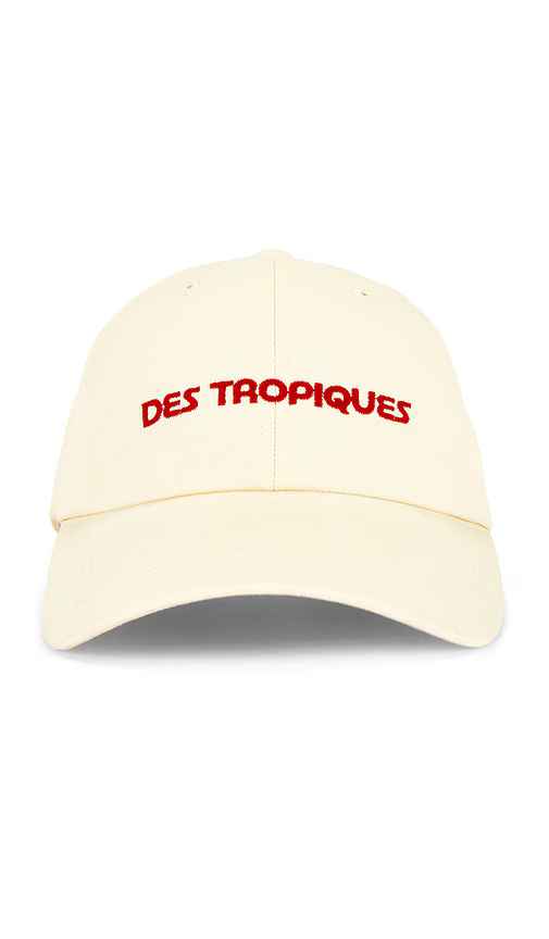Araminta James Tropiques Cap in Ivory. Araminta James Tropiques Cap in Ivory. 100% Cotton. Hand wash. Adjustable back strap. Ventilating eyelets at top. Front and back embroidered design. Brim measures approx 2.75 in length OS measures approx 25 in circumference. AJAM-WA2. TROPIQUES CAP.