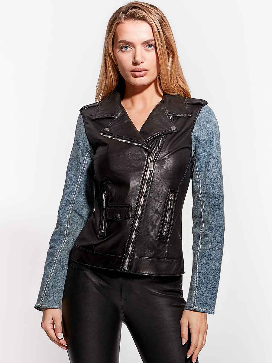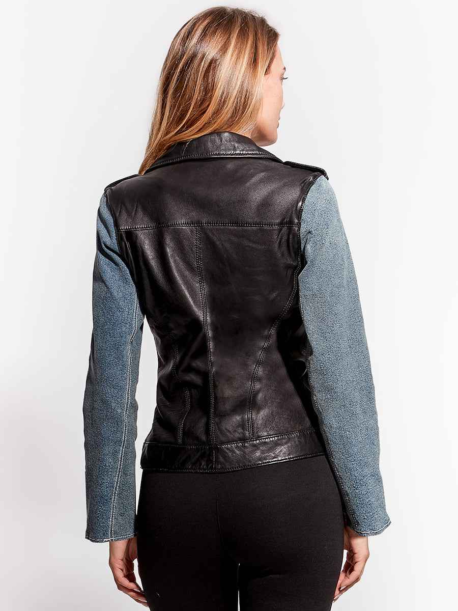 - Washable leather with stretch vintage denim sleeve