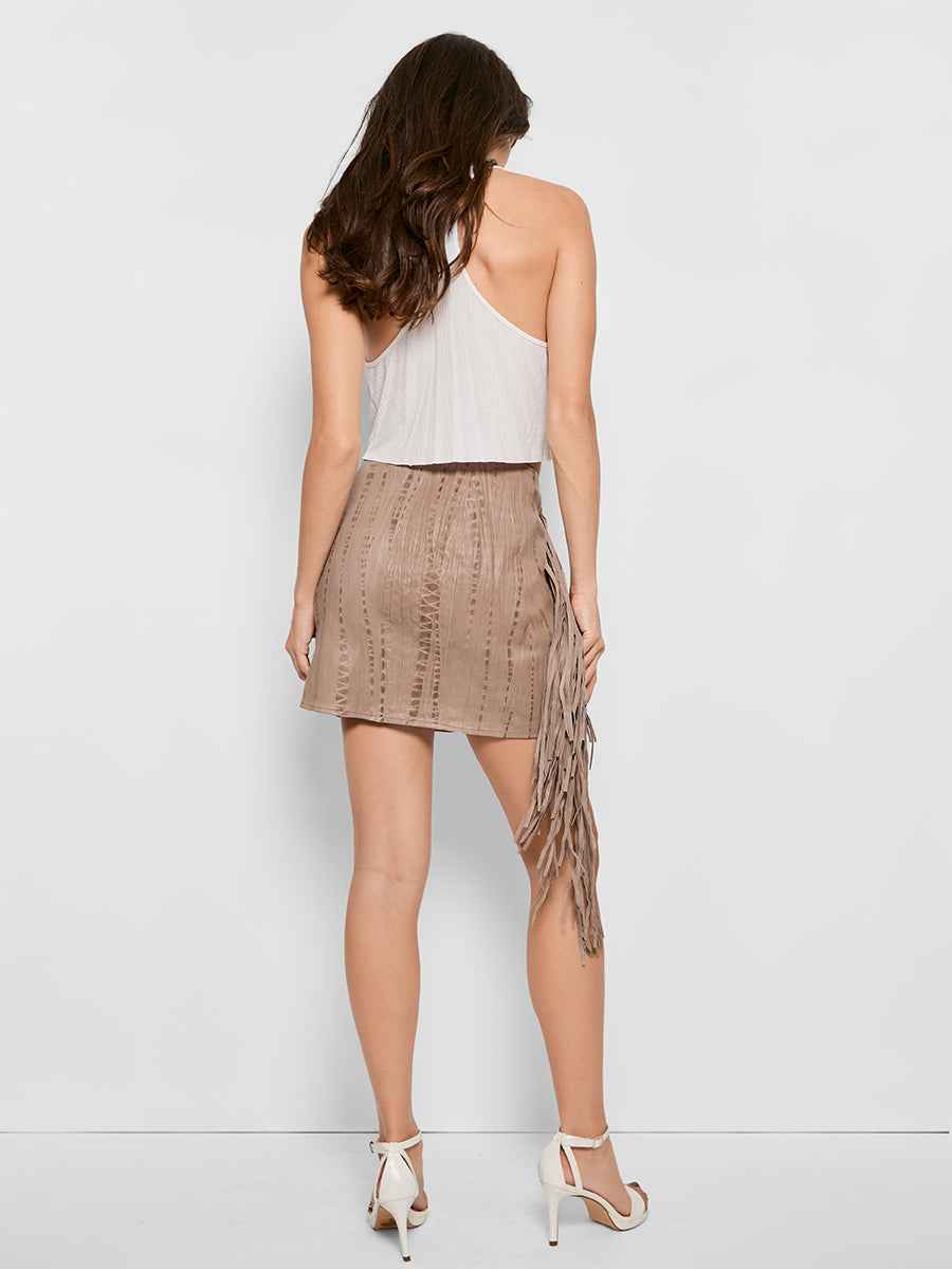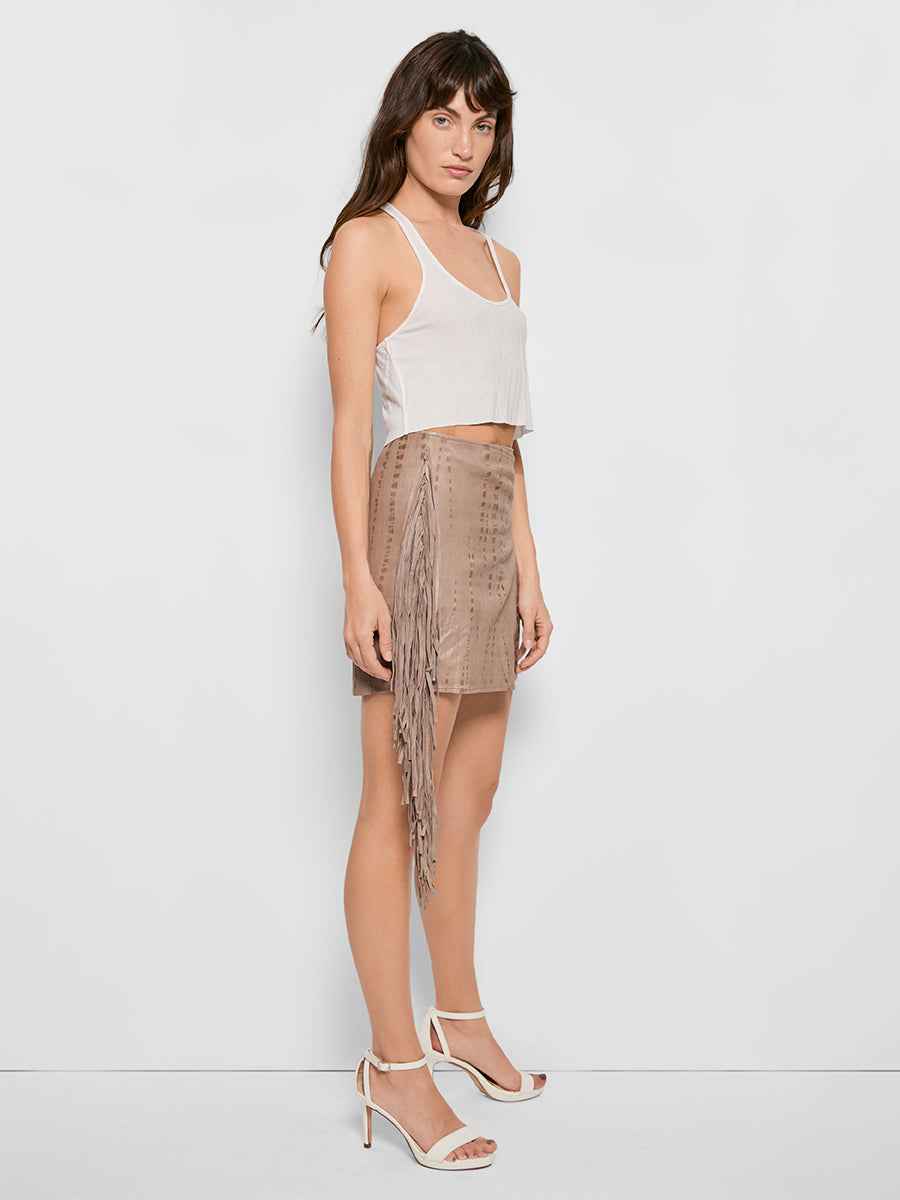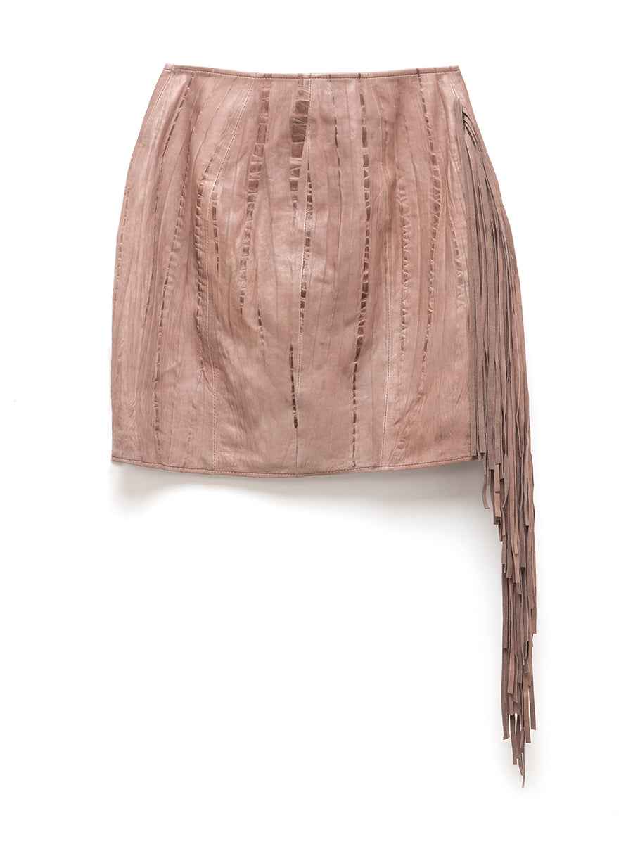 Mini wrap style skirt w/inner hidden snap closure Custom hand tie-dyed Lambskin Front zipper closure Self: 100% Lamb Leather Lining: 100% modal Fits true to size Dry clean by leather professional only Our commitment tomore