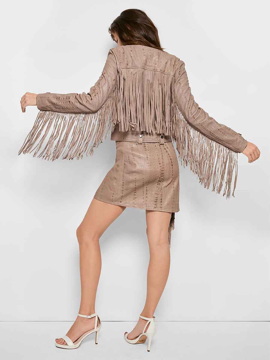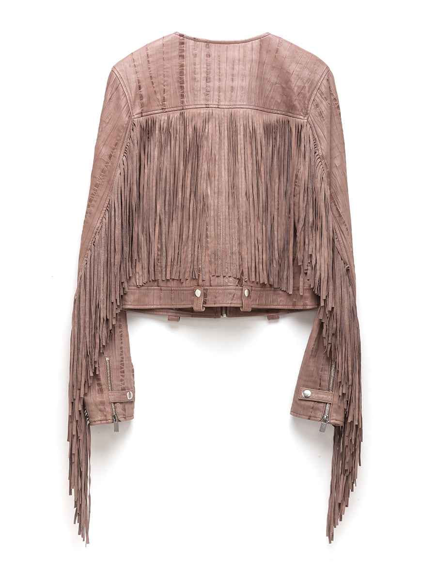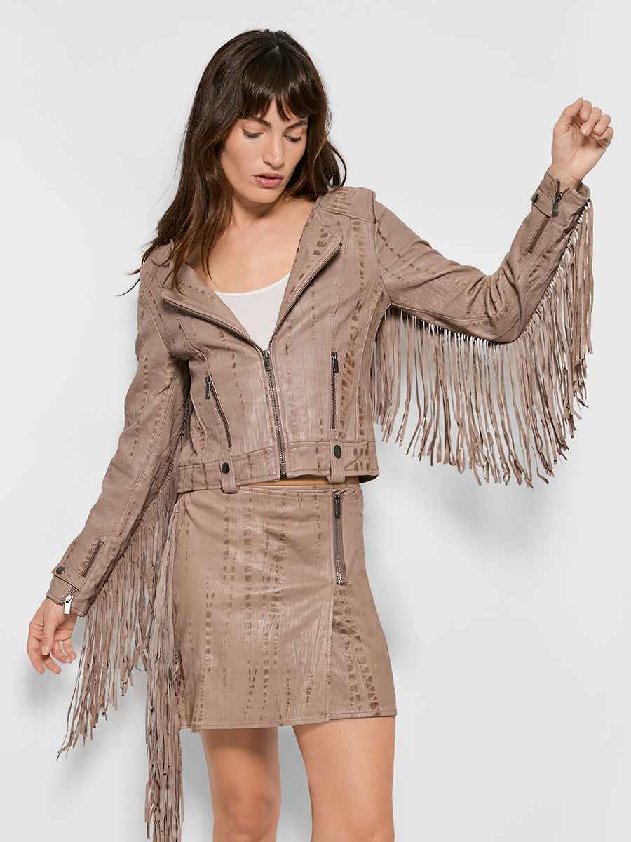 Fitted jacket Custom hand tie-dyed Lambskin CF zipper closure Full fringe detail on back and back of sleeves Body: 100% Lamb Leather Lining: 100% modal jersey Fits true to size Dry clean by leather professional only more