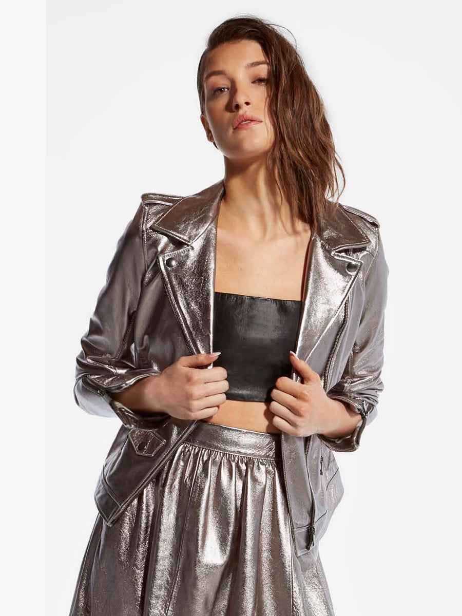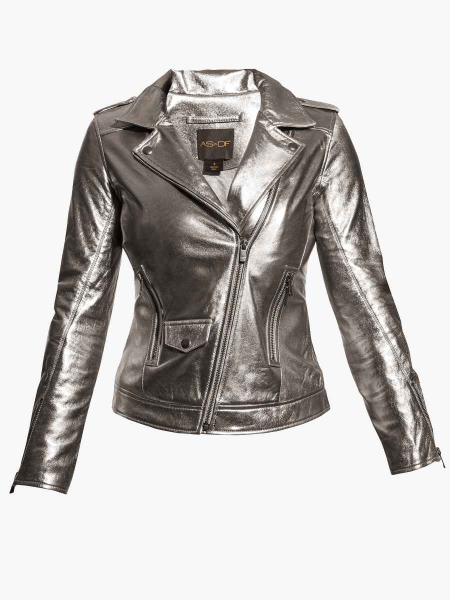 Add glamorous edge to your ensemble. Our Cult Upcycled Leather Jacket is cut from our sustainable Upcycled Leather in a bold metallic finish. Featuring antique silver hardware, moto details & hip length, Cult is a timeless moto-jacket that will compliment any outfit effo...