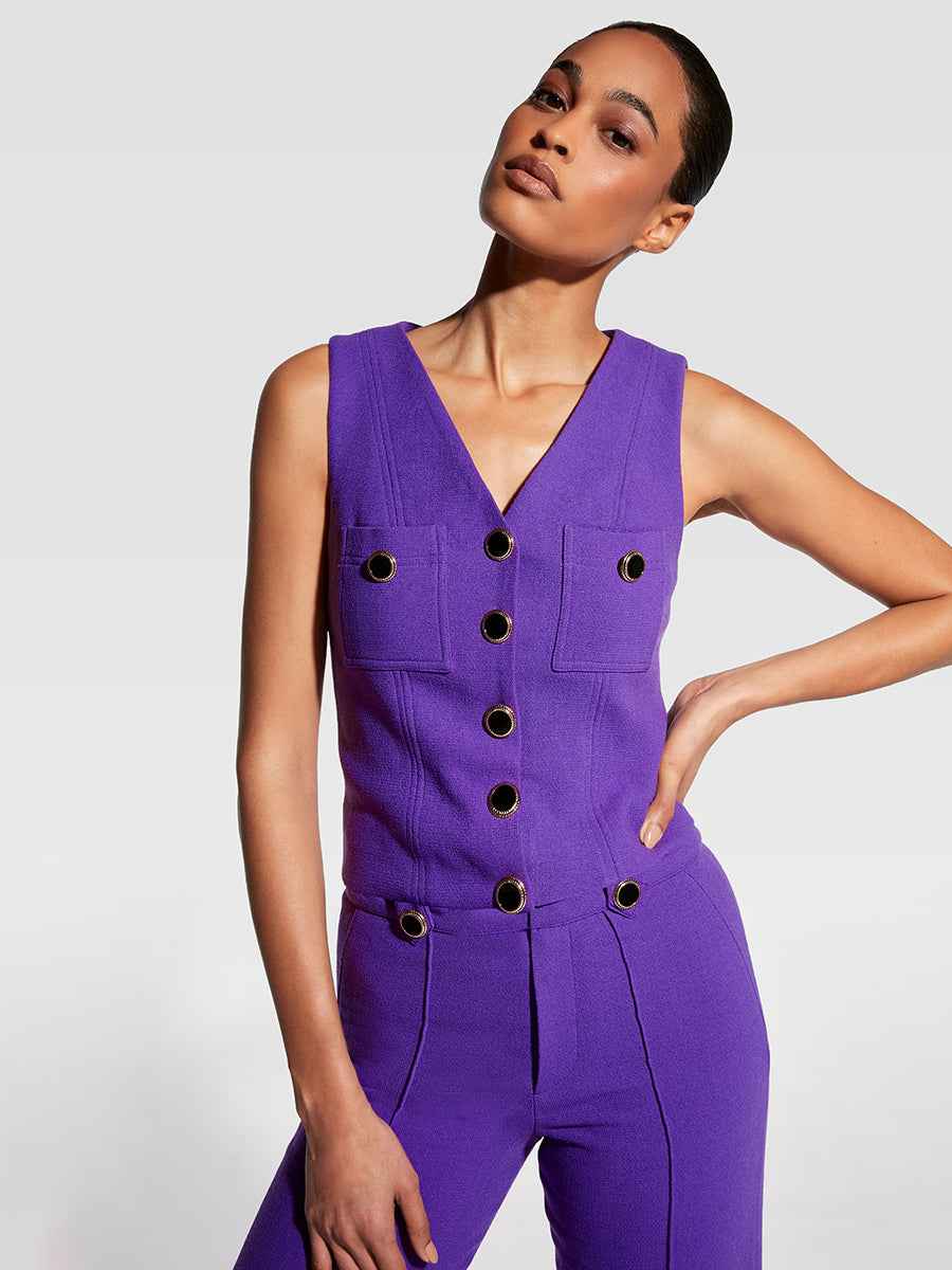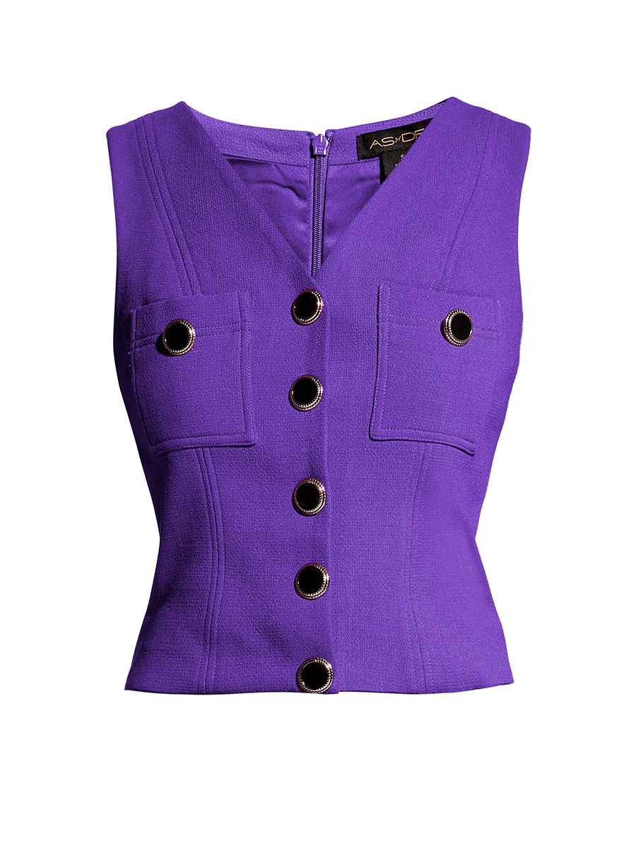 Channel royalty in our Simone Top, made in our beautiful Royal Violet wool crepe. Hitting just at the waist with a faux button-down front and back zipper, youll look dashing every time you put it on. Pair with our Simone Trousers for a full look.more