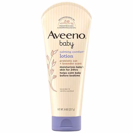 Aveeno Baby Calming Comfort Moisturizing Body Lotion with prebiotic oat & a relaxing lavender scent Made with lavender & vanilla scents, this bedtime baby lotion helps comfort & soothe your little one Calming baby body lotion with nourishing oat absorbs quickly & helps soothe delicate skin Formulate...more