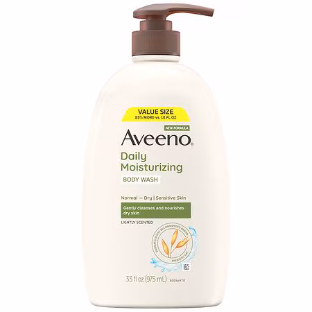 Aveeno Daily Moisturizing Body Wash for both women and men, featuring nourishing prebiotic oat and lightly scented. This body wash gently cleanses and helps skin feel moisturized. 93% of users agreed that the cleanser left their skin feeling moisturized long after they showered. This allergy-tested ...more