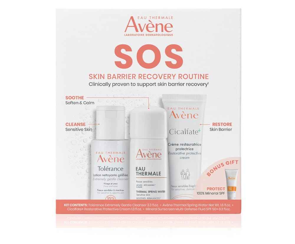 A routine ideal for sensitive, compromised skin. Clinically proven to support skin barrier recovery. Kit includes: Tolrance Extremely Gentle Cleanser 3.3 fl. oz.,Avne Thermal Spring Water 1.7 fl. oz.,Cicalfate+ Restorative Protective Cream 1.3 fl. oz.,Mineral Sunscreen Multi-Defense Fluid SPF 50+ 0....more