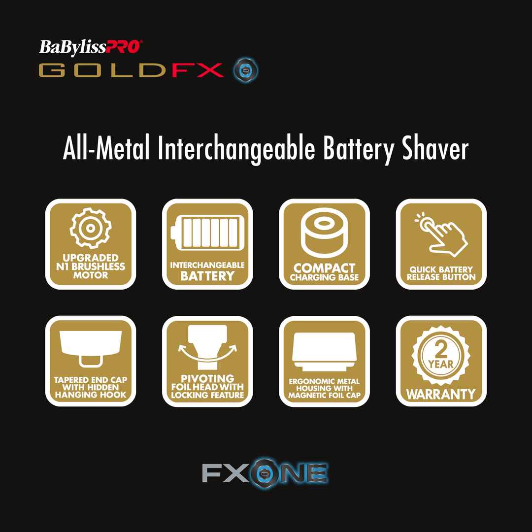 The FXONE GOLDFX Double Foil Shaver is a professional quality shaver with a replacement battery. Experience the new N1 brushless motor with dual ball bearings for greater efficiency. The interchangeable lithium battery pack with a quick release button offers up to 3 hours of run time. Get closer, cl...more