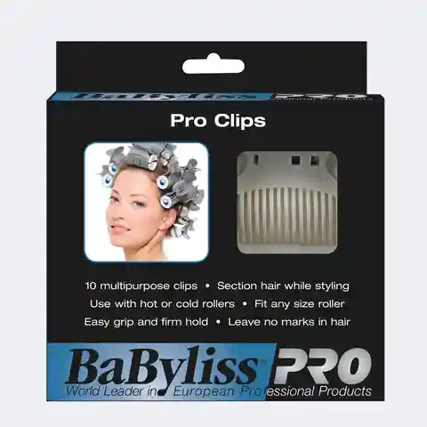 These multipurpose clips section hair while styling and fit any size roller, hot or cold, without leaving marks in hair. Pack includes 10 clips. Easy grip. Firm hold. Gentle styling. | BaBylissPRO Clips for Rollers