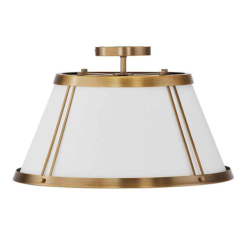 "With its clean lines and timeless shape, our Camille Ceiling Mount goes from classic to contemporary decors with flawless transitional style. The crisp white linen shade is framed in slender bands of warm antique brass for just the right mix of light and shimmer. An acrylic diffuser softens the lig...more
