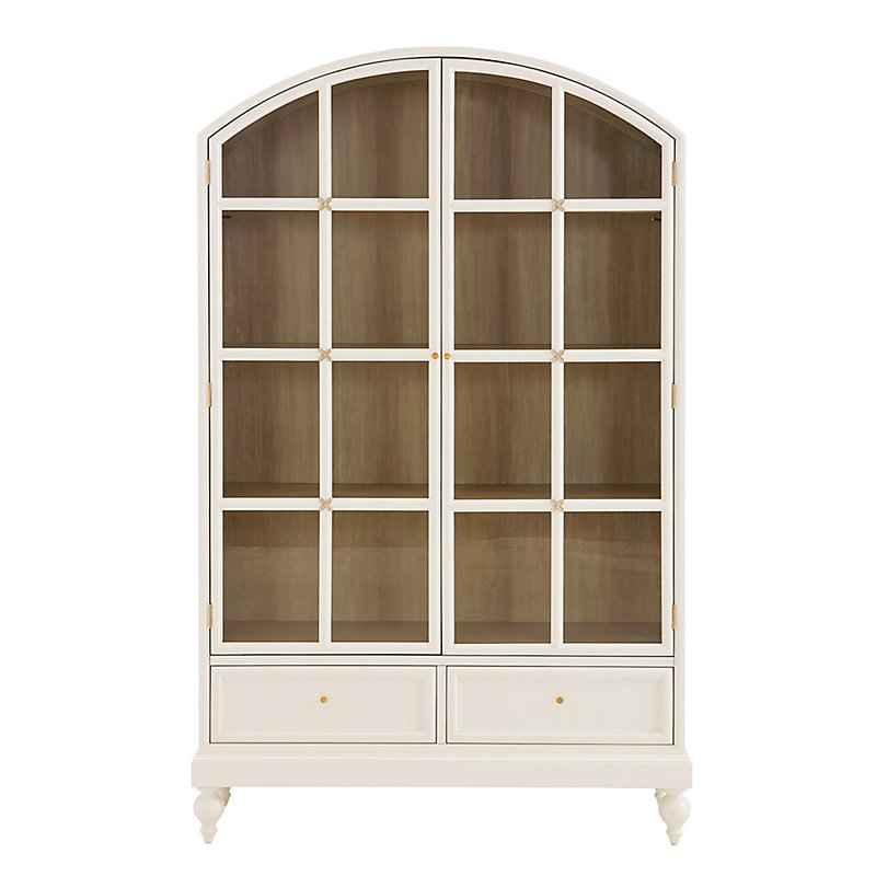 "With its impressive size and striking architectural details, our Bloom Cabinet creates a gorgeous focal point in the living room or dining room. The tall, gracefully arched cabinet is hand finished in soft white and features 8-pane French doors, showcasing whatever you display inside. Mullions are ...more