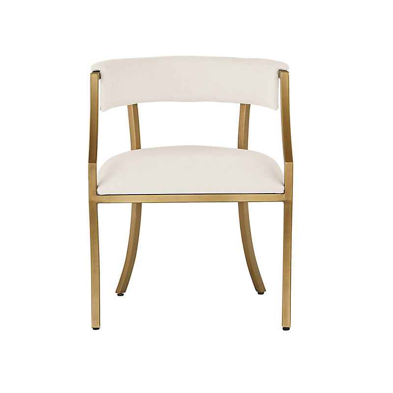 "Modern curves for your dining room or living area. Our Ada Dining Chairs have sleek, sloped arms and expressively splayed legs hand finished in matte antique brass. The generously padded seats and comfy barrel backs are expertly upholstered in our cleanable, family-friendly Sandberg Parchment Insid...more