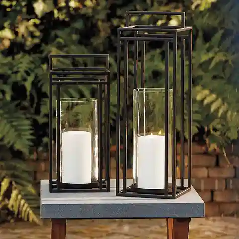 "Outdoor candle holders are a quick, easy way to add ambiance and extra light to your covered outdoor entertaining spaces. Our Theo Lantern does the job with sleek, sophisticated style. Crafted of black powder-coated iron, this contemporary candle lantern features a clear glass hurricane that lifts ...more