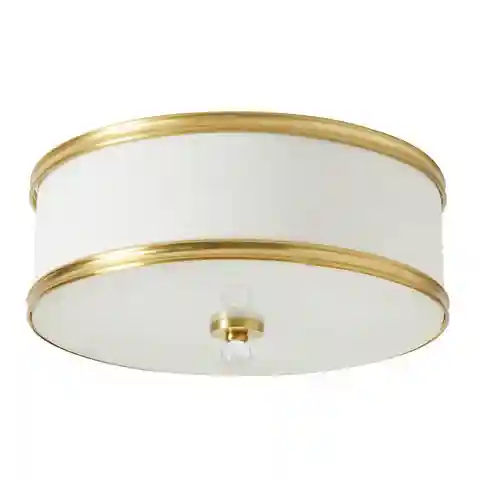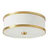 "Our Blaire Drum Ceiling Mount is classic in every detail. Textured white linen is framed in brass finish metal with a frosted glass diffuser for a soft glow. A clear crystal drop finial adds the finishing touch. Blaire Drum Ceiling Mount features: