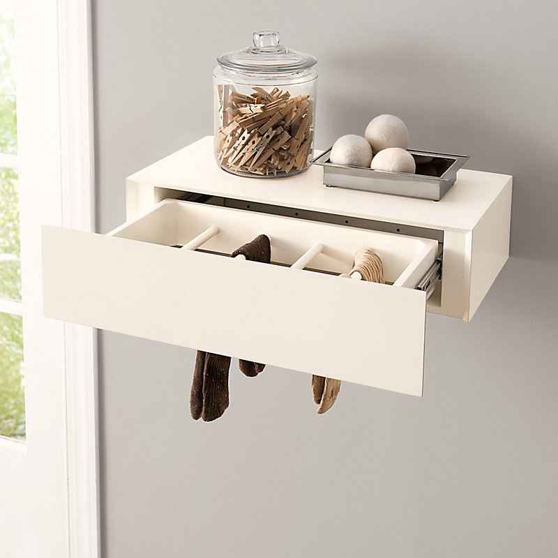 "Cleverly designed to look like a sleek wall shelf, our Jansen Laundry Rack makes drying delicates beautifully easy. Front opens from the bottom like a drawer to reveal four wooden rungs for hanging damp items. The case is sturdily constructed of hardwood with fresh white, moisture-resistant finish....more