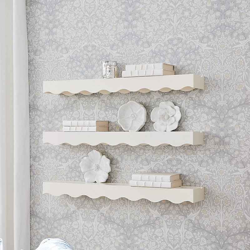 "Our pretty Tulette Shelf puts style back in space-saving storage. Great for showing off dishware in the kitchen, toiletries in the bathroom, or collectibles in the bedroom, this multi-talented floating wall shelf is crafted of hardwood with wavy scalloped edge and fresh white finish. A plate groove...more