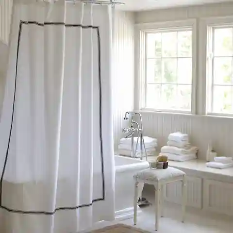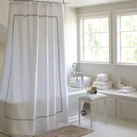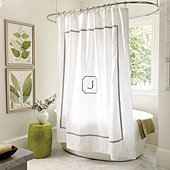 "Designed to mix and match with our Amelie Bath Collection and Bedding, the Shower Curtain is sewn of 240-thread count white cotton and finished with an embroidered border. Customize with a monogram. Amelie Shower Curtain features: