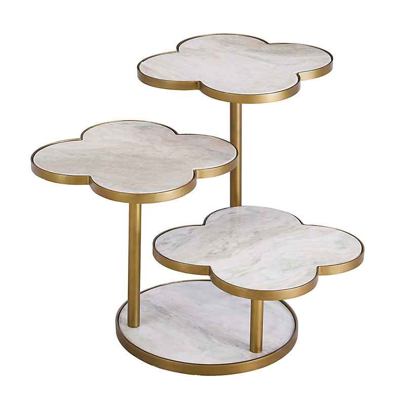 "The whimsical design reminds us of floating clouds. Our Rosemary Accent table features triple-tiered quatrefoil tops and round base inset with gorgeous pink and green marble. Frame is crafted of stainless steel and finished in warm antique brass. Style this unique accent table with books on one lev...more