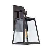 "With its beautifully simple design and clear glass shade, our Eldridge Outdoor Sconce makes a sophisticated, architectural statement in outdoor spaces. The antique bronze finish frame is crafted of powder-coated steel to resist moisture.