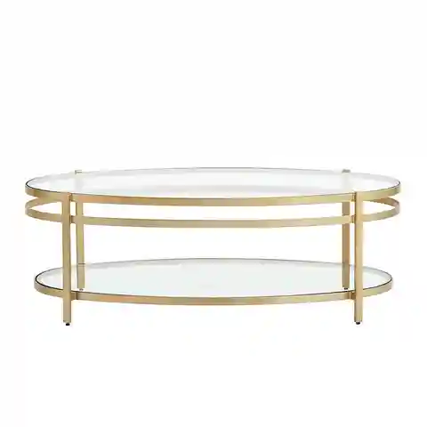 "Our La Jolie Coffee Table is airy in looks and heavy on style. It's perfectly scaled to companion with sofas and sectionals without adding extra visual weight. Antique brass finish frame comes with clear glass top. A glass bottom shelf completes the light silhouette.